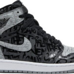 The Air Jordan 1 Retro High Rebellionaire draws inspiration from the original Air Jordan 1 Shadow with its simple black and grey color blocked upper. Printed on the leather construction . graffiti style text covers the upper. At the base . a white and grey Air sole completes the design.