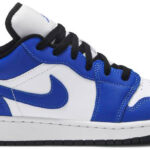 Made for big kids . the Air Jordan 1 Low GS ‘Game Royal’ updates the classic silhouette with traditional color blocking . highlighted by a white leather base with contrasting overlays in a vibrant blue finish. A Jumpman icon adorns the nylon tongue . while Jordan Brand’s retro Wings logo is embroidered across the heel. The low-top rides on a traditional white foam midsole . featuring an encapsulated Air sole unit in the heel.