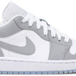 Lace up in a legend with these women’s Air 1 Low trainers from Jordan. In a White and Wolf Grey colour block style . these low-profile kicks keep the iconic design lines from the ’80s. They have a premium leather upper and feature a secure lace up fastening and a padded ankle collar. Underfoot . these trainers are sat on a lightweight midsole with encapsulated Air cushioning for premium comfort everytime you step out. They have a grippy rubber tread and are finished with the iconic Swoosh logo . Jordan Jumpman and Wings to the heel.