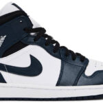 The Air Jordan 1 Mid ‘Armory Navy’ updates the familiar design with a refreshed color palette. The mid-top carries a leather upper that combines a clean white base with contrasting dark teal accents on the Swoosh . eyestay . and forefoot and heel overlays. A white Jumpman icon decorates the woven tongue tag . while a color-matched Wings logo is imprinted on the lateral collar flap. The mid-top rides on a sturdy rubber cupsole . featuring an Air-sole unit encapsulated in a lightweight foam wedge.