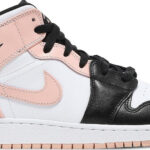 Made for big kids . the Air Jordan 1 Mid GS ‘Arctic Orange’ highlights pastel accents on a sneaker modeled after Peter Moore’s original AJ1 High from 1985. The leather upper combines a crisp white base with a black toe wrap and matching black forefoot overlays. Soft pink accents settle on the Swoosh . heel overlay and collar flap . featuring a debossed Wings logo on the lateral side. The sneaker is mounted on a standard rubber cupsole with encapsulated Nike Air cushioning in the heel.