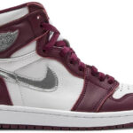 The Air Jordan 1 Retro High OG ‘Bordeaux’ dresses the archetypal silhouette in a white leather upper with vinous leather overlays at the forefoot . heel and collar. Similar to the CO.JP ‘Midnight Navy’ colorway . the sneaker is accented with a metallic silver Swoosh and a jeweled Wings logo on the lateral ankle. A woven Nike Air tongue tag atop the lightly padded nylon tongue delivers an OG touch. A traditional two-tone AJ1 cupsole packs encapsulated Nike Air cushioning under the heel.