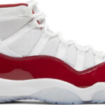 The Air Jordan 11 Retro ‘Cherry’ showcases familiar two-tone color blocking that recalls the low-top AJ11 ‘Varsity Red’ from 2001. The upper is crafted from white ballistic mesh with tonal webbing eyelets and a shiny patent leather mudguard in a bold scarlet hue. Matching red accents land on the interior collar and an embroidered Jumpman on the white leather heel overlay. Lightweight cushioning arrives via a plush Phylon midsole . supported underfoot by a carbon fiber spring plate and a translucent rubber outsole.