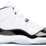 The Air Jordan 11 Retro GS ‘Concord’ 2018 features the same design hallmarks as its full-sized counterpart . starting with the ballistic mesh upper in white. The upper transitions to a black patent leather mudguard . which then gives way to a translucent rubber outsole fitted with the Concord herringbone-tread inserts that give the shoe its name.