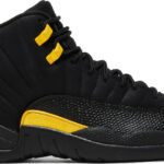 The Air Jordan 12 Retro ‘Black Taxi’ delivers a stealthy colorway of Michael Jordan’s championship silhouette. The upper is crafted from black leather . accented with tonal stitched detailing and bolstered with lizard-textured mudguards in color-matched synthetic leather. The monochromatic design is disrupted by contrasting yellow accents . including molded eyelets . a small midfoot overlay . and embroidered Jumpman branding on the tongue. A matching black Phylon midsole packs full-length Zoom Air cushioning for improved responsiveness.