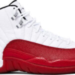 The 2023 edition of the Air Jordan 12 Retro ‘Cherry’ reintroduces the OG colorway of the shoe that Michael Jordan wore during his penultimate championship season. Highlighted with radiating stitched lines . the white leather upper is fortified with lizard-textured overlays in a bold scarlet finish. The Jumpman logo graces the tongue in black embroidery . matching the shoe’s textile collar lining. The sneaker rides on a Phylon midsole with full-length Zoom Air cushioning. Underfoot . the semi-translucent red rubber outsole reveals black herringbone traction pods and an exposed carbon fiber shank plate.