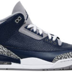 The Air Jordan 3 Retro ‘Georgetown’ is clad in the signature colors of the Hoyas . the team that Michael Jordan victimized on the way to an NCAA national championship. The classic silhouette features a navy tumbled leather upper . reinforced with signature elephant print overlays at the toe and heel. Jumpman branding hits adorn the grey synthetic leather tongue and molded navy heel panel. Lightweight cushioning is provided by a polyurethane midsole enhanced with a visible Nike Air unit under the heel.