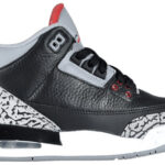 This is the grade-school edition of the Air Jordan 3 Retro ‘Cement .’ released in November 2011. Virtually all of the design hallmarks of the original are present on this model . including a black . tumbled leather upper . elephant-print overlays and a visible Air Sole unit in the midsole. An embroidered red Jumpman logo on the tongue is matched by a molded version of the logo on the heel.