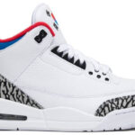 This iteration of the Air Jordan 3 commemorates the 1988 Olympics in Seoul. Taking inspiration from the South Korean flag . the shoe features black . red . and blue accents on the inner lining and collar. The white upper . constructed from tumbled leather . includes the Jordan 3’s signature elephant print panels. Korean characters appear on the inside of each tongue: ‘’ (Seoul) on one side; the 1988 games motto . ‘ ’ (Harmony and Progress) on the other.
