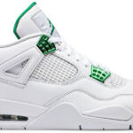 The Air Jordan 4 Retro ‘Green Metallic’ is drawn from a four-piece Metallic Pack that features a single accent color. Here . the metallic green hue is limited to the sneaker’s molded eyelets . interior tongue . and the Jumpman logos that adorn the heel and woven tongue tag. Those elements stand out against a pristine all-white leather build . appointed with standard Air Jordan 4 details that include quarter-panel netting . a visible Air sole unit and an extended pull tab at the heel.