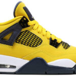 The 2021 edition of the Air Jordan 4 Retro GS ‘Lightning’ brings back a sought-after 2006 colorway in grade school sizing. Like the original . the mid-top makes use of a bright yellow nubuck upper with black molded eyelets and matching black netting on the quarter panel and throat. Dark grey accents settle on the wings . interior tongue . and molded Jumpman logo on the heel overlay. A second Jumpman icon decorates the woven tongue tag. The sneaker is mounted on a white foam midsole with visible Air-sole cushioning in the heel. A grey rubber outsole features a grippy herringbone traction pattern underfoot.