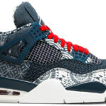 The Air Jordan 4 Retro SE ‘Sashiko’ gives the iconic silhouette a textile makeover that replaces traditional leather construction. The paneled upper is treated to varying abstract prints for a patchwork-like effect . complete with decorative embroidery that gives the nod to Japanese Sashiko stitching — a traditional technique originally used to reinforce or repair garments for long-lasting wear. A two-tone palette of Deep Ocean and Sail is disrupted by Fire Red accents atop the tongue and within the visible Air sole unit.