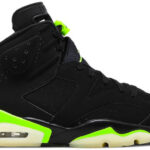 The Air Jordan 6 Retro ‘Electric Green’ showcases a simplistic two-tone color scheme that calls to mind an Oregon PE colorway that surfaced online in 2018. The iconic silhouette sports a black nubuck upper with contrasting hits of neon green on the tongue and spoiler-like pull tab. Tonal Jumpman branding is embroidered on the sneaker’s back heel. Lightweight cushioning is provided by a polyurethane midsole . enlivened with additional green pops and fitted with a visible Air sole unit. Underfoot . the semi-translucent rubber outsole is treated to a glow-in-the-dark finish.