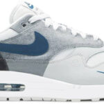 The Air Max 1 City Pack ‘London’ completes a two-piece pack that also includes an ‘Amsterdam’ colorway. The mixed-material upper features varying shades of grey with contrasting pops of dark blue on the branding elements. They include a Nike Swoosh on the quarter panel . a mini-Swoosh on the forefoot . and River Thames embroidery coursing through a Nike Air logo on the heel. Abstract depictions of the London Eye and Big Ben appear on either side of the forefoot overlay.