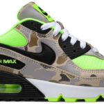 Celebrating the silhouette’s 30th anniversary . the Nike Air Max 90 ‘Green Camo’ showcases an eye-catching design that highlights the sneaker’s individual components. A neon green mesh base is fortified with leather overlays finished in a camo print made up of muted earth tones. Contrasting black hits are applied to the TPU accents up top . as well as the cassette design element that surrounds the Max Air unit.