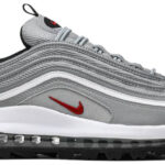The Air Max 97 Golf ‘Silver Bullet’ brings a classic Nike silhouette to the links. The upper replicates the look of the OG Air Max 97 colorway . featuring a silver mesh base with wavy leather overlays and an embroidered red Swoosh at the quarter panel. A white foam midsole houses the sneaker’s all-important full-length Max Air unit . reinforced underfoot by a black rubber outsole with an integrated traction pattern made for the fairway.