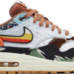 The Nike Air Max 1 SP Concepts Heavy nods to youth culture of the 1970’s and their style. Bleached denim . bandana . corduroy . and tiger camo M-65 jacket material make up the upper . offering a playful look. On the Swooshes . embroidered flowers add a vintage-inspired styling. From there . a speckled white midsole with a gum outsole completes the design.