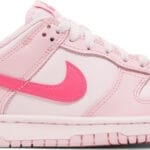 The Dunk Low GS ‘Triple Pink’ also known as ‘Barbie’ refreshes the classic style of the retro Nike basketball shoe. The sneaker’s leather upper is constructed entirely from a light pink base and overlays. Nike branding is accented in hot pink across the Swoosh . tongue tag . and heel. A breathable nylon tongue provides comfort while the rubber outsole anchors the build.