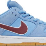 While the retro silhouette is rooted in basketball . the Nike Dunk Low Premium SB ‘Philadelphia Phillies’ shifts the focus to the baseball diamond . featuring a distinctive color palette that pays homage to the historic MLB franchise. The suede upper is finished in Valor Blue . contrasted by a Team Maroon Swoosh outlined in white trim. A Nike SB tag decorates the stuffed tongue . while mismatched interior tags display a cheesesteak graphic on the left shoe and a Liberty Bell graphic on the right. Underfoot . a gum rubber outsole provides grippy traction.