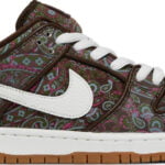 The Nike Dunk Low Pro Premium SB ‘Paisley’ treats the retro sneaker to a vintage-fashion makeover. Rendered in a blend of green . pink . blue . and brown hues . an allover paisley print permeates the textile upper . trimmed in brown leather piping and designed to tear away over time . revealing an off-white suede underlay. Branding elements include a white leather Swoosh and an embroidered Nike wordmark on the brown leather heel tab. Underfoot . a gum rubber outsole provides grippy traction.