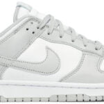 This offering of the Nike Dunk Low keeps things simple and traditional featuring a White leather base with matching nylon tongues . midsole . and insoles. Grey Fog leather overlays . Swooshes . laces . insole branding . and rubber outsole completes the design.