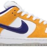 The Nike SB Dunk Low “Laser Orange” is a vibrant colorway of the beloved Dunk silhouette from Nike’s skateboarding division. The crisp . casual . and easy to wear design features Laser Orange suede overlays on the forefoot . collar . and quarter panel. A clean white leather base appears on the perforated toe . mid-panel . and heel. A purple patent leather Swoosh is located on either side. The royal hue also reappears on the heel tab . which features white “Nike” embroidery. A puffy white nylon tongue . tonal cotton laces . and a white nylon tongue tab with purple “Nike SB” detailing adds to the classic appearance.