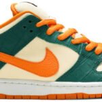 The Nike SB Dunk Low appears with a Legion Pine and Kumquat color scheme on the upper’s leather construction . while a crocodile-embossed etching emerges on the overlays for an elegant look. The Swoosh and heel tab take on a pebbled construction . while the sockliner features Zoom Air technology.