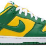 The Nike Dunk Low SP ‘Brazil’ replicates the look of the classic ‘Brazil’ Dunk from 2001 . featuring a simple two-tone color scheme that combines a yellow leather base with contrasting green overlays. Nike branding adorns the heel tab and stitched-on woven tag atop the lightly padded nylon tongue. The low-profile silhouette is mounted on a sturdy white foam midsole . reinforced underfoot by a green rubber outsole.