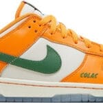 The Florida A&M University x Nike Dunk Low ‘Rattlers’ is designed by FAMU alum Caitlyn Davis . a participant in Nike’s HBCU-focused Yardrunners campaign. The low-top dons a smooth leather upper . featuring a white foundation with orange overlays and a green signature Swoosh. ‘COLAC’ — short for ‘College of Love and Charity’ — is embroidered on the lateral forefoot . while an inscription across the heel reads ‘We Bragg Different.’ Additional branding elements include ‘FAMU’ lace dubrae . rattlesnake tongue tags . and the school’s founding year embroidered on the heel tab.