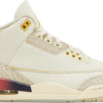 The J Balvin x Air Jordan 3 Retro ‘Medellín Sunset’ reunites the creative partners on a tropical colorway of the iconic silhouette. Inspired by the breathtaking sunsets of J Balvin’s hometown of Medellin . Colombia . this special-edition AJ3 sports an ivory-colored leather upper with tonal elephant print overlays at the forefoot and heel. A gradient blend of yellow . orange and dark purple lands on the rear midsole and molded back tab . featuring mismatched Nike branding on the left shoe and J Balvin’s smiley face icon on the right. An embroidered gold Jumpman graces the tongue. Undergirding the sneaker is a blue-tinged translucent rubber outsole.