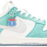 Made in collaboration with the Korean retailer . the Kasina x Nike Dunk Low ‘Road Sign’ features colors inspired by the signage that lines the major highway connecting Busan and Seoul. The upper combines off-white leather with Neptune Green suede overlays and a grey suede Swoosh. Navy blue heel tabs replace Nike branding with ‘Busan’ and ‘Seoul’ on the left and right shoe. Additional details include Kasina’s logo on the lateral heel and the retailer’s name printed in Korean lettering on the tongue tag.
