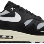The Patta x Nike Air Max 1 ‘Black’ represents the fourth colorway of the collaborative series . featuring a twist on the classic Air Max 1 design from 1987. Like its predecessors . this pair is distinguished by a wavy mudguard . rendered here in black leather and accented with an embroidered mini-Swoosh on the lateral forefoot. Matching black leather is utilized on the quarter panel and heel overlay . while the rest of the upper is composed of matte silver mesh. The sneaker rides on a pre-yellowed polyurethane midsole . fitted with a visible Max Air unit under the heel.