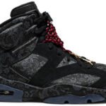 The women’s Air Jordan 6 Retro ‘Singles Day’ celebrates the Chinese commercial holiday with a monochromatic black finish . enlivened with a tonal floral and basketball print throughout the textile upper and midsole. The sneaker’s lone contrasting pop of color lands atop the tongue . where a metallic gold Jumpman hangs from a burgundy woven lace shield. Standard Air Jordan 6 details remain intact . including a spoiler-like heel tab and visible Air sole cushioning.