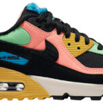 The Nike Air Max 90 ‘Fur Multi-Color’ updates Tinker Hatfield’s vintage runner with a multicolor composition on the upper . featuring a black textile toe box . pink leather overlay and lime green textile around the collar. A black leather mudguard is complemented by a matching black Swoosh . covered in a furry texture that’s repeated on the tongue tag and interior lining. A dull gold finish is applied to the midsole wedge . housing the sneaker’s signature Max Air unit.