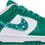 The Nike women’s Dunk Low ‘Green Paisley’ updates the vintage hoops shoe with a patterned Swoosh. The signature branding element is covered in green paisley-print textile . along with a heel tab marked with embroidered Nike lettering. The rest of the upper is clad in white leather with contrasting green leather overlays at the forefoot and heel. Atop the breathable nylon tongue . a woven tag displays traditional Nike branding. The sneaker is mounted on a standard rubber cupsole . featuring white sidewalls and a green rubber outsole.
