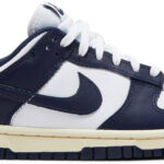 The Nike women’s Dunk Low ‘Vintage Navy’ showcases a familiar two-tone palette that recalls the ‘Villanova’ colorway from the original ‘Be True to Your School’ series from 1985. Unlike its OG predecessor . this pair features a low-cut build . complete with a pre-yellowed rubber midsole that accentuates the sneaker’s vintage aesthetic. The all-leather upper combines a clean white base with contrasting navy overlays and a color-matched Swoosh.
